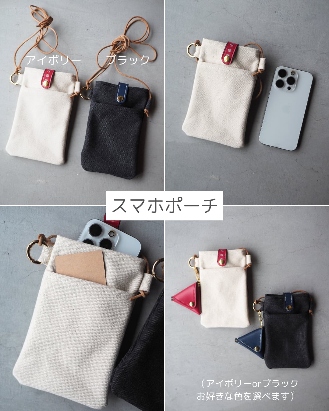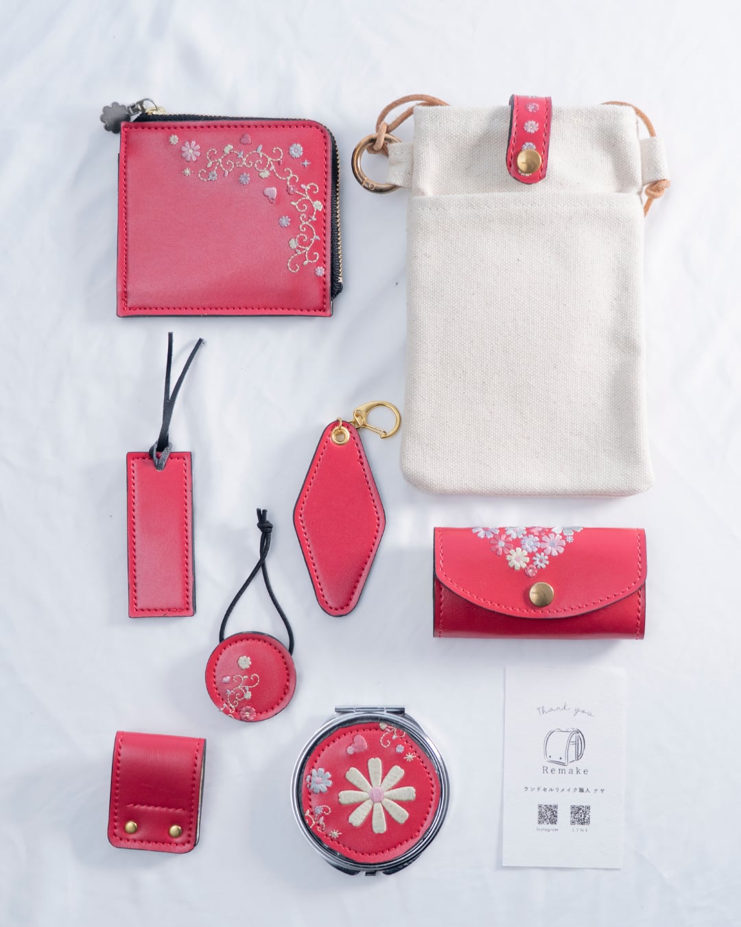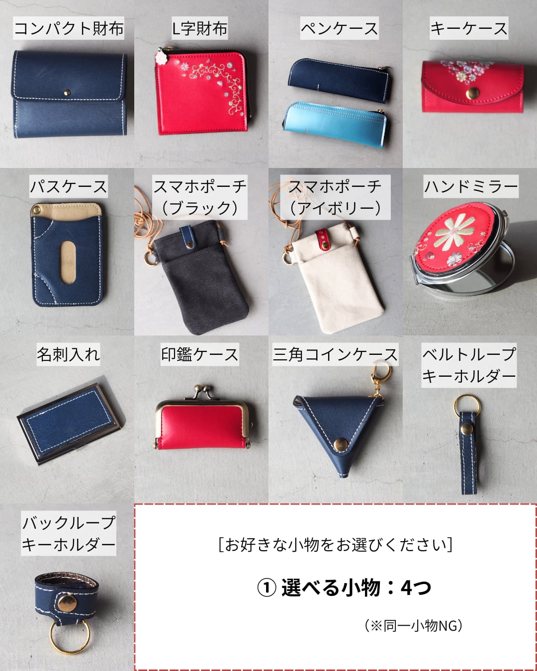 ペンケース/キーケース/パスケース/スマホポーチ(アイボリー)/スマホポーチ(ブラック)/ハンドミラー/名刺入れ/印鑑ケース/三角コインケース/バックループキーホルダー/ベルトループキーホルダー
