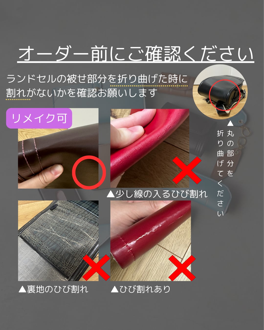 ②ひび割れたランドセルのリメイクはできません。